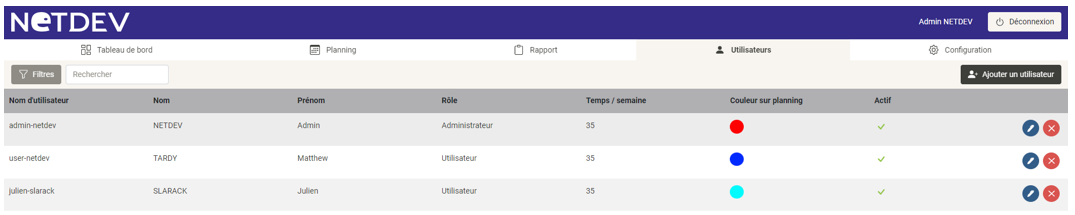 Dans l’onglet « Utilisateurs » vous pouvez voir la liste des utilisateurs avec leurs informations.