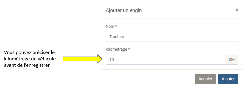 La partie « Engins » vous permet de visualiser la liste de vos engins ainsi que d’en ajouter.