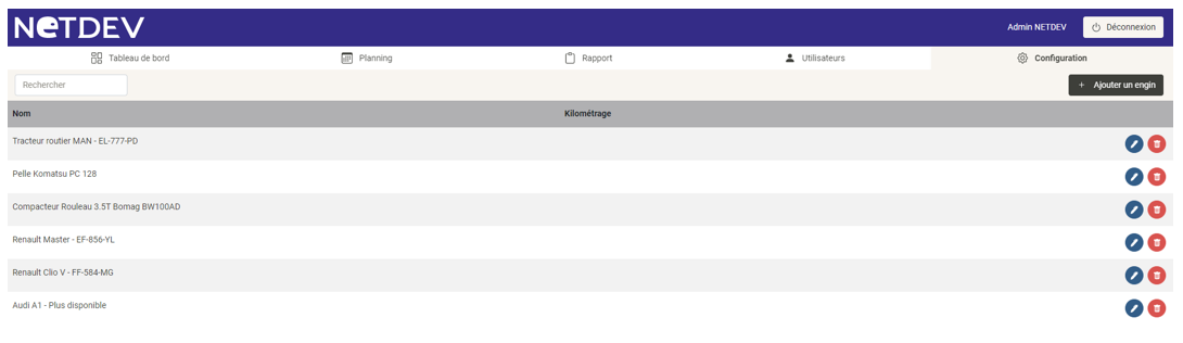 Depuis la liste vous pouvez effectuer une recherche, modifier un engin ou bien le supprimer.