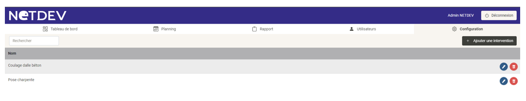 Depuis la liste vous pourrez modifier le nom de l’intervention ou bien la supprimer.